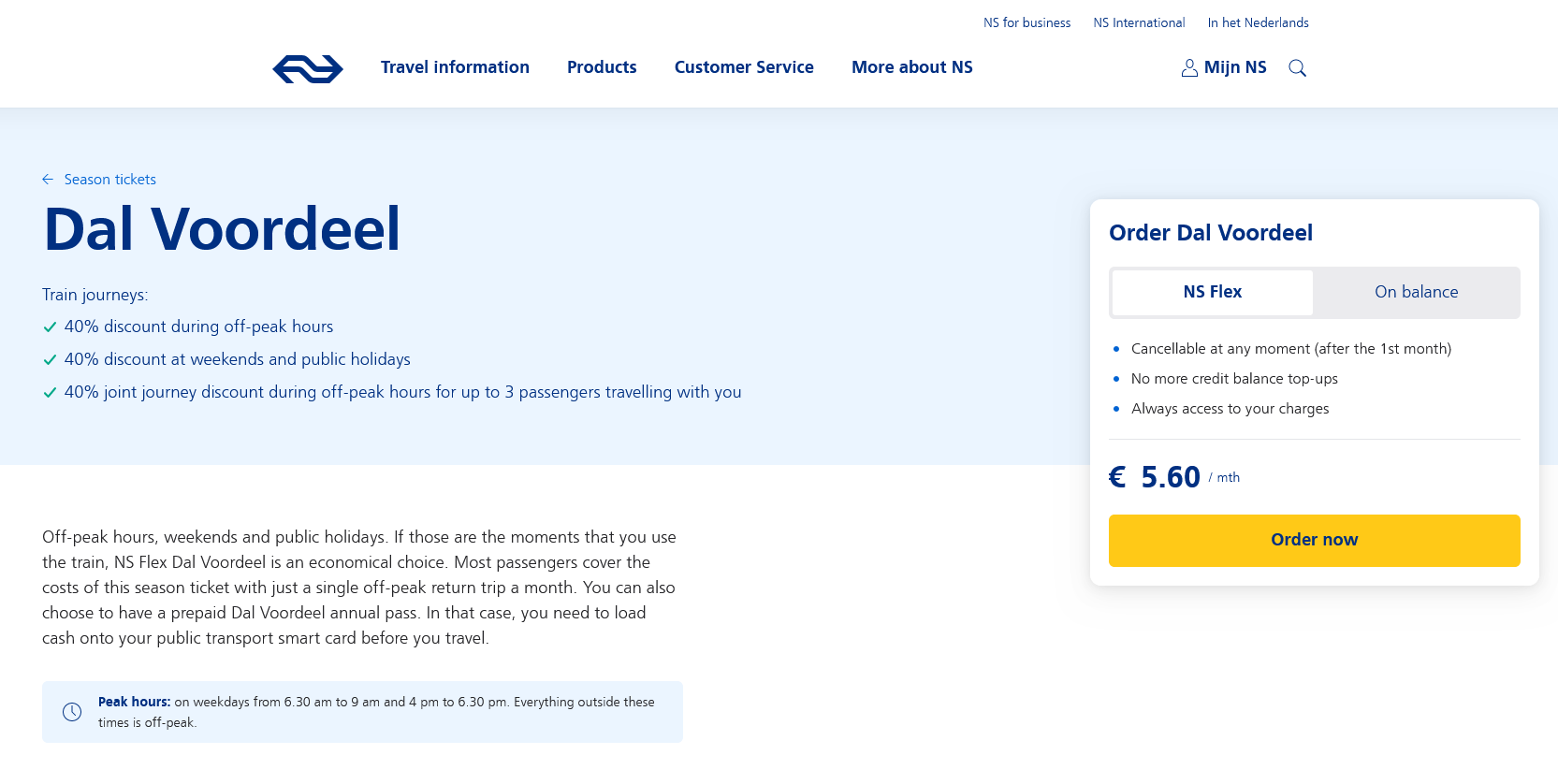 - Dal Voordeel: 40% Ermäßigung außerhalb der Hauptverkehrszeiten (Mo. - Fr. 6:30 - 9 & 16 - 18:30 Uhr), ganztags an Wochenenden und Feiertagen. Kosten: 5,60 € pro Monat als Flex-Abo oder 67,20 € pro Jahr.