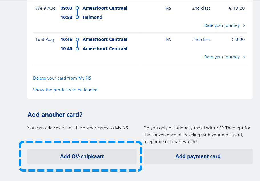 Sobald die OV-chipkaart angekommen ist, könnt ihr Euren “Mijn NS”-Account auf ns.nl anlegen. Hinterlegt dann unbedingt die Nummer eurer vorhandenen OV-chipkaart in Eurem Account auf der NS-Webseite. Der Webshop akzepziert keine deutschen Adressen während des Bestellvorgangs, deshalb ist es wichtig, dass die in Eurem Account bereits eine OV-chipkaart hinterlegt ist, auf die dass Abo dann aufgebucht wird. Die entsprechende Option heißt “Add OV-chipkaart” in der englischen Variante der Webseite: