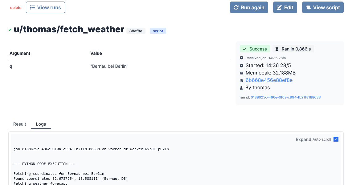 The “past run” view in Windmill, showing the peak memory usage for the script
