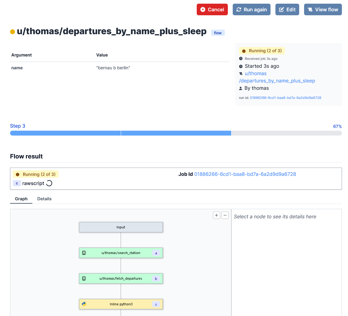 In addition, Windmill shows a progress bar for each execution of a workflow (based on the current step and the total steps in a workflow). There is no difference between production and “test” runs, both can be opened at anytime and inspected:
